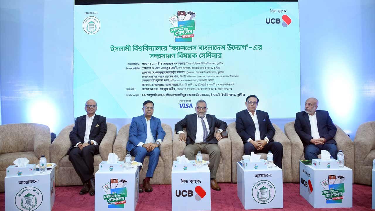 নগদ লেনদেনের ওপর নির্ভরতা কমিয়ে আধুনিক ও নিরাপদ ডিজিটাল পেমেন্ট ব্যবস্থাকে জনপ্রিয় করতে কুষ্টিয়ার ইসলামী বিশ্ববিদ্যালয়ে দিনব্যাপী বিশেষ সেমিনার অনুষ্ঠিত হয়েছে। বাংলাদেশ ব্যাংকের উদ্যোগে এবং ইউনাইটেড কমার্শিয়াল ব্যাংক পিএলসি (ইউসিবি)-এর ব্যবস্থাপনায় সোমবার (১৯ জানুয়ারি) বিশ্ববিদ্যালয়ের বীরশ্রেষ্ঠ হামিদুর রহমান মিলনায়তনে এই কর্মসূচি আয়োজন করা হয়।