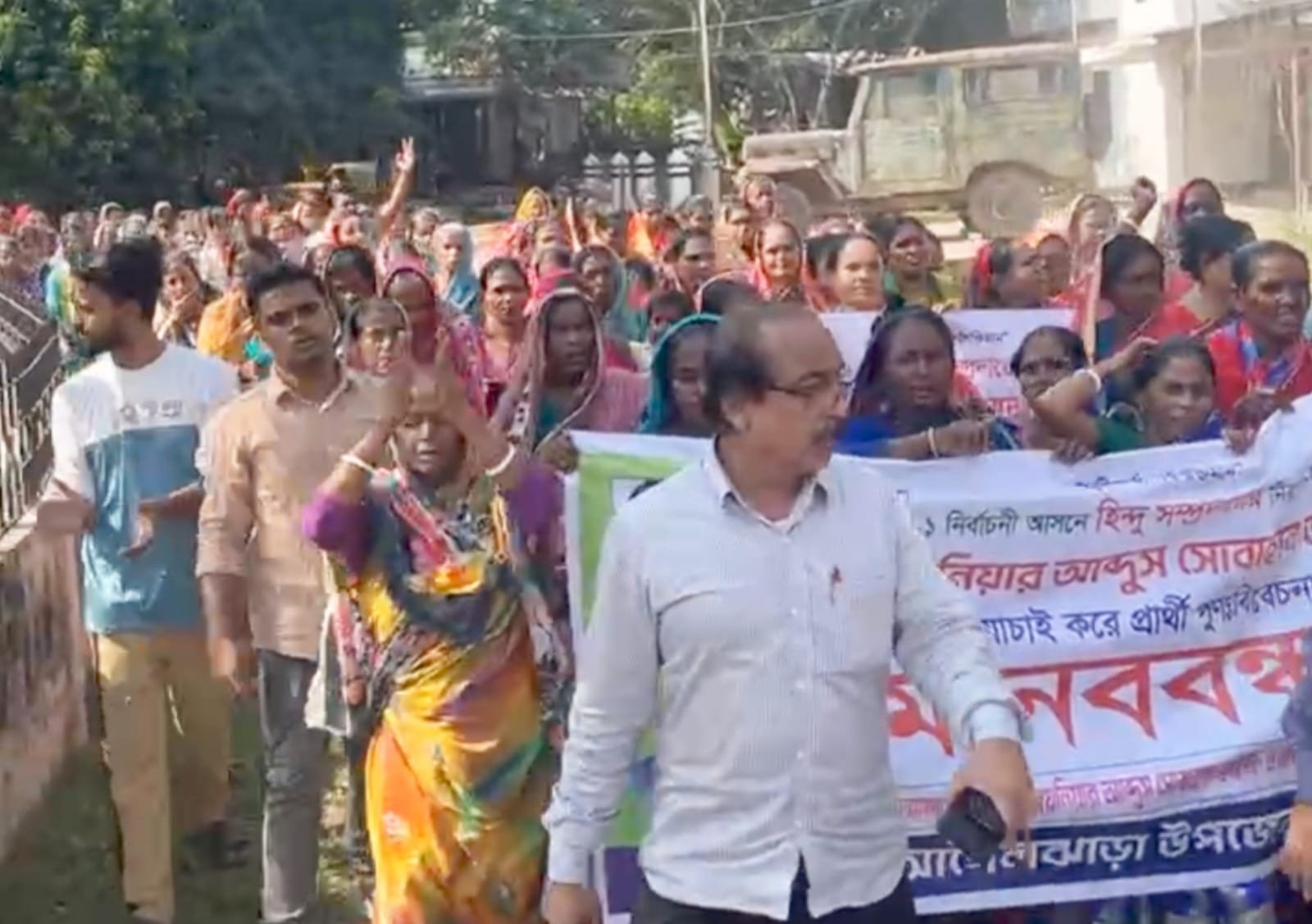 মানববন্ধন চলাকালীন অনুষ্ঠিত বিক্ষোভ সমাবেশে হিন্দু সম্প্রদায়ের নেতা নবীন সরকারের সভাপতিত্বে বক্তব্য রাখেন-রবীন্দ্রনাথ গাইন, দীলিপ ঘটক, বিধান সরকার, হরিপদ বাড়ৈ, হাসি মধু, শিখা রাণী, প্রমিলা মধুসহ অন্যান্যরা।