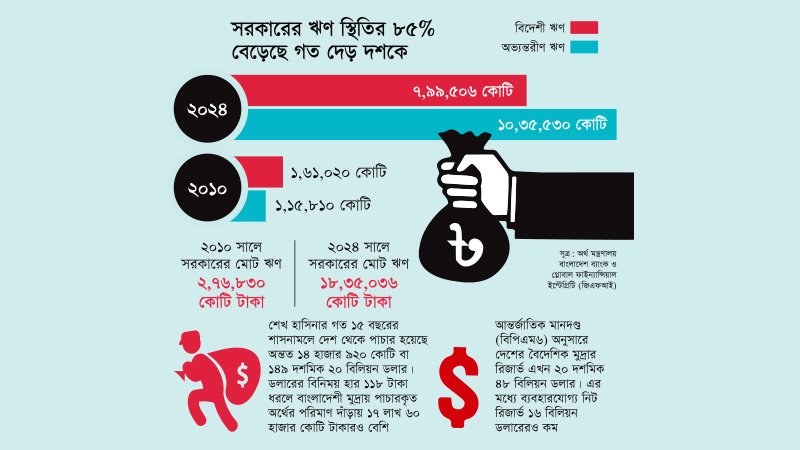 ঘোষিত বাজেটে সরকারের পরিচালন ব্যয় মেটানো ও উন্নয়ন কর্মকাণ্ডের কথা বলে দেশী-বিদেশী উৎস থেকে এ ঋণ নেয়া হয়েছে। যদিও শেখ হাসিনা সরকারের বিরুদ্ধে সীমাহীন অনিয়ম-দুর্নীতির বেশুমার অভিযোগ রয়েছে। এ সময়ে অবাধ লুণ্ঠনের শিকার হয়েছে দেশের ব্যাংক খাত। জনগণের লুণ্ঠিত এসব অর্থ পাচার হয়েছে ইউরোপ-আমেরিকাসহ বিভিন্ন দেশে। যুক্তরাষ্ট্রভিত্তিক গবেষণা প্রতিষ্ঠান গ্লোবাল ফাইন্যান্সিয়াল ইন্টেগ্রিটির (জিএফআই) তথ্য বিশ্লেষণে পাওয়া হিসাব অনুযায়ী, শেখ হাসিনার দেড় দশকের শাসনামলে দেশ থেকে অন্তত ১৪ হাজার ৯২০ কোটি বা ১৪৯ দশমিক ২০ বিলিয়ন ডলার পাচার হয়েছে। বাংলাদেশী মুদ্রায় পাচারকৃত অর্থের পরিমাণ দাঁড়ায় অন্তত ১৭ লাখ ৬০ হাজার কোটি টাকা (বর্তমান বিনিময় হার অনুযায়ী প্রতি ডলারে ১১৮ টাকা ধরে)। যদিও বর্তমানে বাংলাদেশের ব্যবহারযোগ্য নিট রিজার্ভ রয়েছে মাত্র ১৬ বিলিয়ন ডলারেরও কম।
