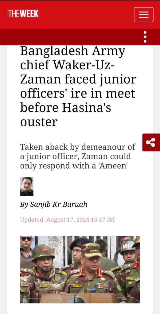 চন্দ্রদ্বীপ ডেস্ক : বৈষম্যবিরোধী ছাত্র আন্দোলনের নেতৃত্বে কোটা সংস্কার আন্দোলন একপর্যায়ে রূপ নেয় সরকার পদত্যাগের এক দফায়। পুলিশবাহিনী পরিস্থিতি সামাল দিতে ব্যর্থ হলে একপর্যায়ে সারা দেশে সেনা মোতায়েন করে সরকার। তাতেও শেষ রক্ষা হয়নি, দেশ ছেড়ে পালাতে বাধ্য হন শেখ হাসিনা। তবে ৫ আগস্ট শেখ হাসিনা পালানোর আগে ২ আগস্ট এক কঠিন পরিস্থিতির মুখোমুখি হন সেনাপ্রধান জেনারেল ওয়াকার-উজ-জামান। ওই দিন এক বৈঠকে তরুণ সেনা কর্মকর্তাদের ক্ষোভের মুখে পড়েন তিনি। খবর ভারতীয় সাপ্তাহিক সংবাদ সাময়িকী দ্য উইকের।