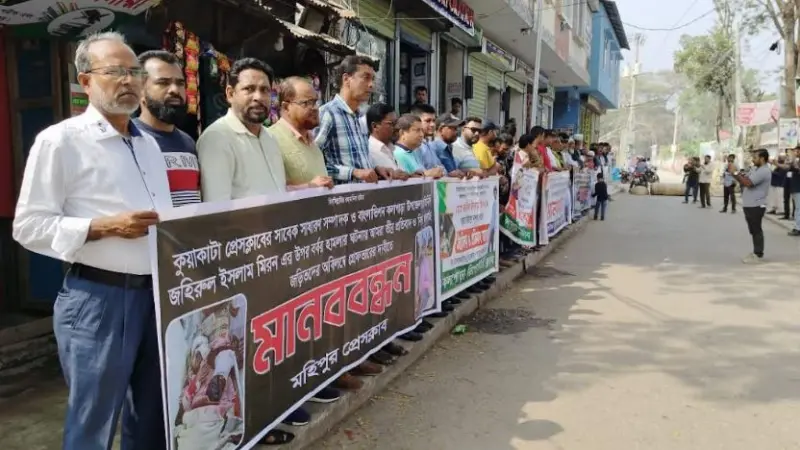 পটুয়াখালীর কুয়াকাটায় সাংবাদিক জহিরুল ইসলাম মিরনের ওপর সন্ত্রাসী হামলার প্রতিবাদ ও দোষীদের দ্রুত গ্রেপ্তারের দাবিতে মানববন্ধন অনুষ্ঠিত হয়েছে। শুক্রবার (৯ ফেব্রুয়ারি) বিকেল সাড়ে চারটায় কুয়াকাটা পৌরসভা কার্যালয়ের সামনে ব্যবসায়ীদের উদ্যোগে এ কর্মসূচি পালন করা হয়।